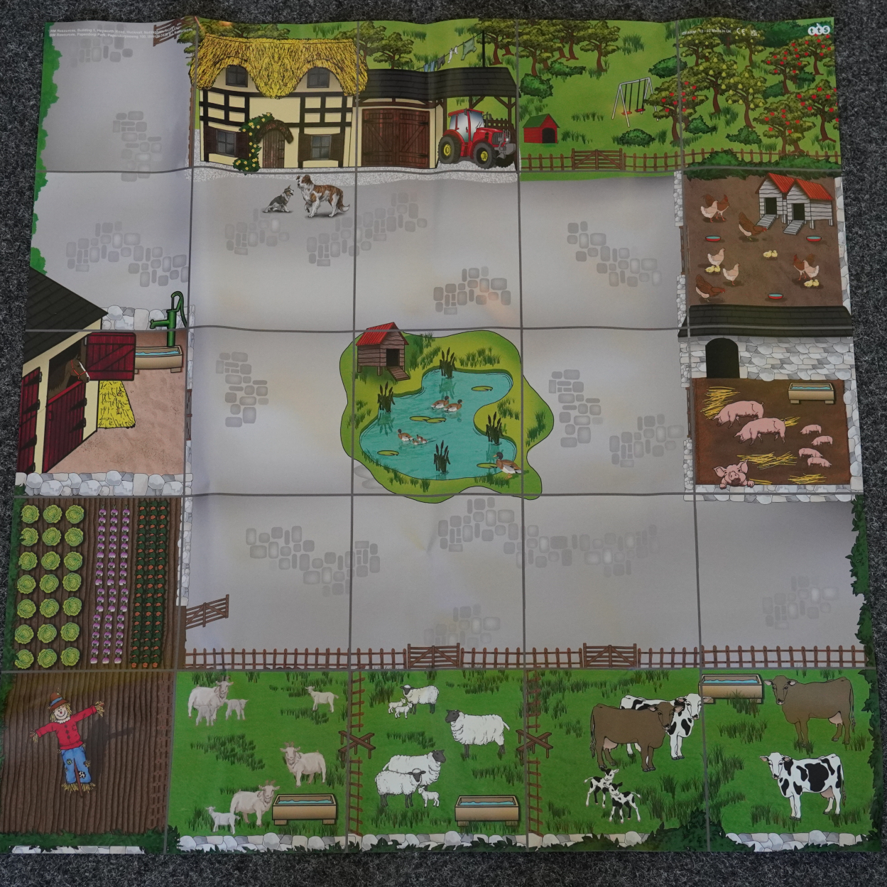 Die Bodenmatte „Bauernhof“ für den Bee-Bot zeigt einen großen Bauernhof mit Kühen, einem Feld, Hühnern und allem, was sonst noch dazugehört. Gemeinsam mit ihrem Bee-Bot erkunden die Kinder den Bauernhof Stück für Stück. Der Bee-Bot kann zum Beispiel so programmiert werden, dass er im Stall das Hühnerfutter holt und am Teich vorbei zu den Hühnern fährt. Der Kreativität sind hierbei keine Grenzen gesetzt.